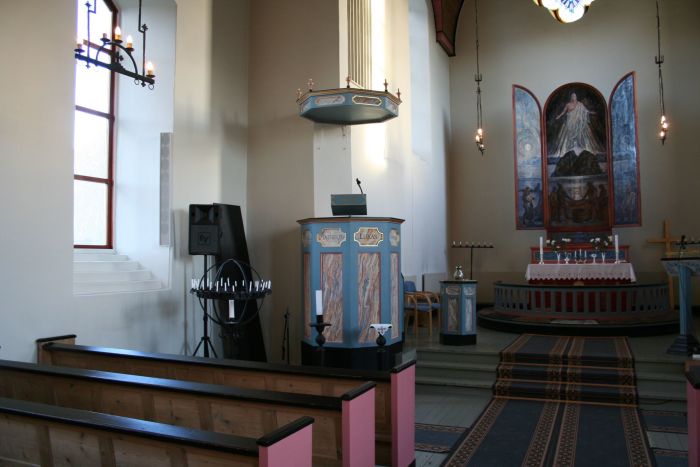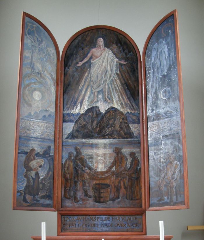 Kirkeleksikonet forteller at kirken har et «stort krusifiks» fra gamlekirken istedenfor altertavle. Først i 1999 kom altertavlen til. Den er laget av Karl Erik Harr. Den har form av et triptykon/alterskap med blanding av kristne og lokale motiver.