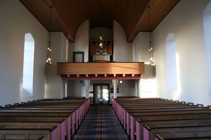 Det er orgelgalleri innenfor inngangen. Koret åpner seg mot skipet i sin fulle bredde, og korgulvet er hevet tre trinn over skipets gulv. Himlingen er tredelt, med tønnehvelv midt på og flat himling på sidene.