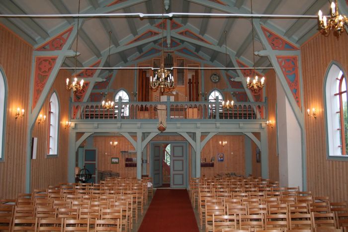 Det er orgelgalleri innenfor inngangen. Kor og skip er i samme bygningsdel. Korgulvet er et lite trinn høyere enn skipets guld, som et lavt podium, men det er for øvrig ikke noe markant korskille. Kirken er stivet av med strekkfisker på tvers av kirkerommet. Uvanlig nok for en så pass tradisjonelt utformet kirke, er kirkerommet møblert med jærstoler. Prekestolen står ved nordveggen og har oppgang fra koret. Kirkeleksikonet daterer prekestol og døpefont til 1893, uten at undersøkte kilder sier noe om arbeid utført i kirken på den tiden.