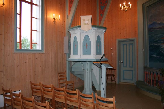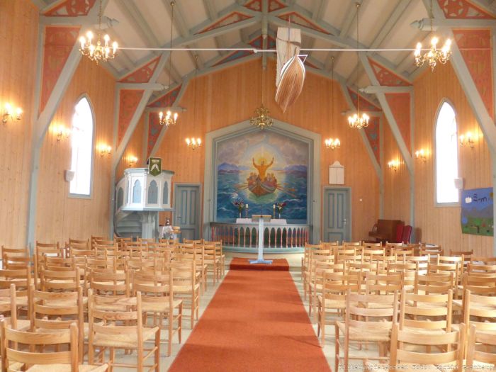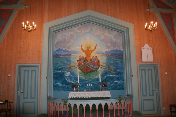 Derimot ble kirken restaurert i 1963 (og 2001 og 2018), og ny altertavle kom på plass i 1965. Den er laget av Marianne Hallbauer, og bildet viser Jesus og disiplene i båt på Genesaretsjøen idet Jesus stiller stormen (jf. Luk 8, 22–24). Landskapet rundt sjøen minner om de lokale forholdene på stedet.