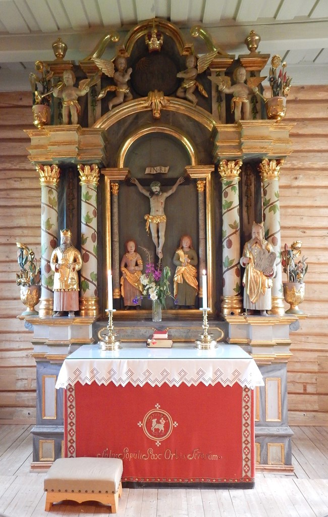 Mye av det sentrale inventaret er etter tradisjonen laget av Kviten, muligens i samarbeid med Hans Jonassen Felde. Det gjelder altertavle, prekestol, døpefont og korskille. Altertavlen er en portaltavle som i hovedfeltet har figurer av Kristus på korset omgitt av Maria og Johannes. I sidefeltene ser vi (t.v.) Aron og Moses. På gesimsen over er det en rekke engler, hvorav de to innerste holder en medaljong med påmalt årstall. Opprinnelig fant man kongemonogrammet for Kristian VII her, men det ble i 1818 erstattet med Jahve-tegnet. Ved en senere restaurering kom monogrammet tilbake til kirken fra privat eie, men det sies at det var vanskelig å plassere i tavlen og ble sendt tilbake til eieren. Kongekronen over medaljongen er bevart. Tavlen ble gitt av Anders Lunde og Gjertrud Bjørensdatter, Anders Fladødegaarden og Ingeborg Bjørensdatter i 1789. Forbildet skal ha vært Lars Pinneruds tavle i Fluberg kirke, som igjen er modellert etter Friedrich Ehbisch’ altertavle i Vor Frue kirke i København.