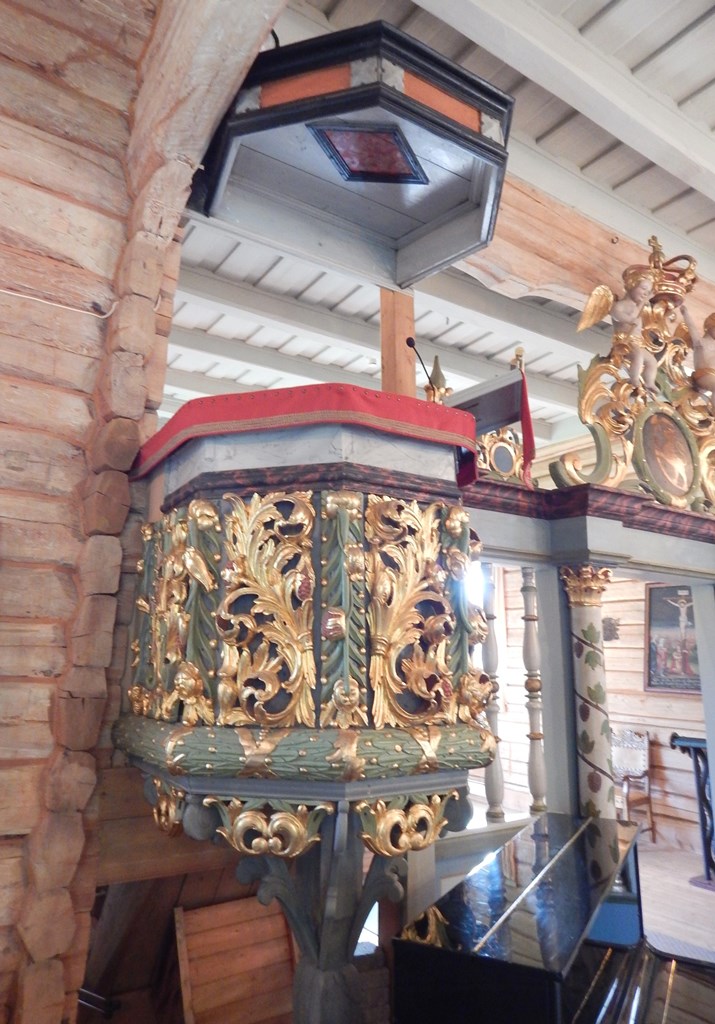 Prekestolen står på nordsiden av krysset og har oppgang fra koret. Stolen har fem fag med akantusutskjæringer isprengt drueklaser og frukter. Foten er sekskantet og ble forhøyet ved en restaurering av kirken. Akantusen på oppgangen skiller seg noe fra den på selve stolen. Stolen har en femkantet, kasseformet himling der baksiden er bredest.