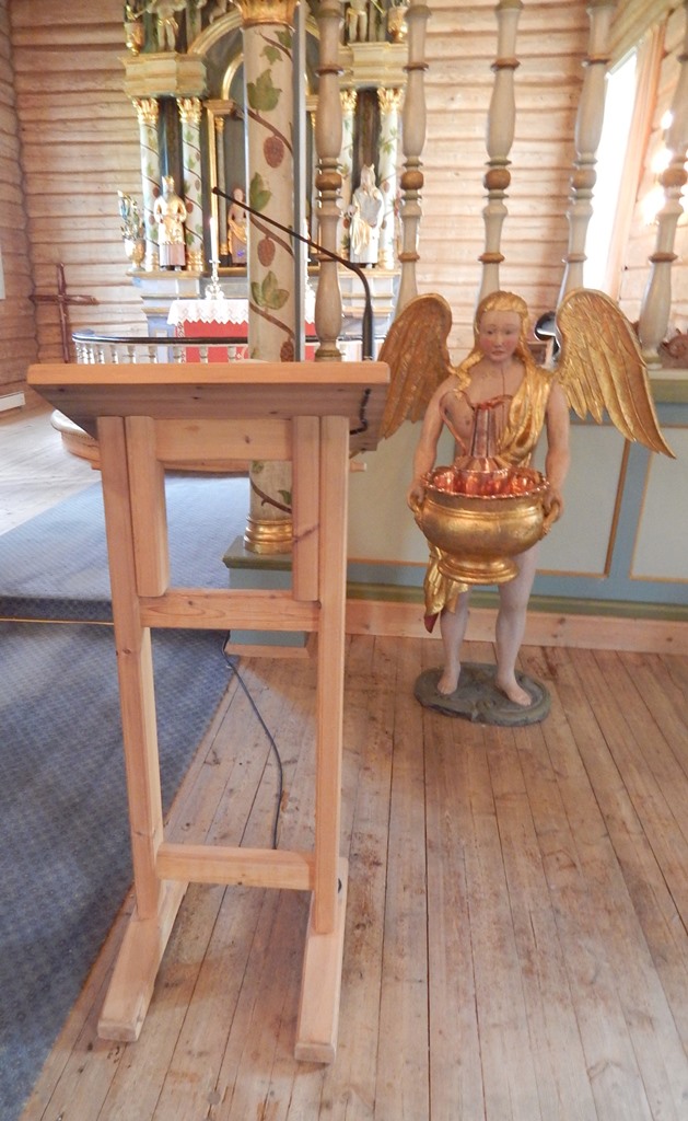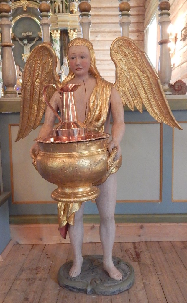 Døpefonten har form av en engel som holder et fat, og sammenlignes gjerne med en tilsvarende i Ulnes kirke som også tilskrives Kviten.