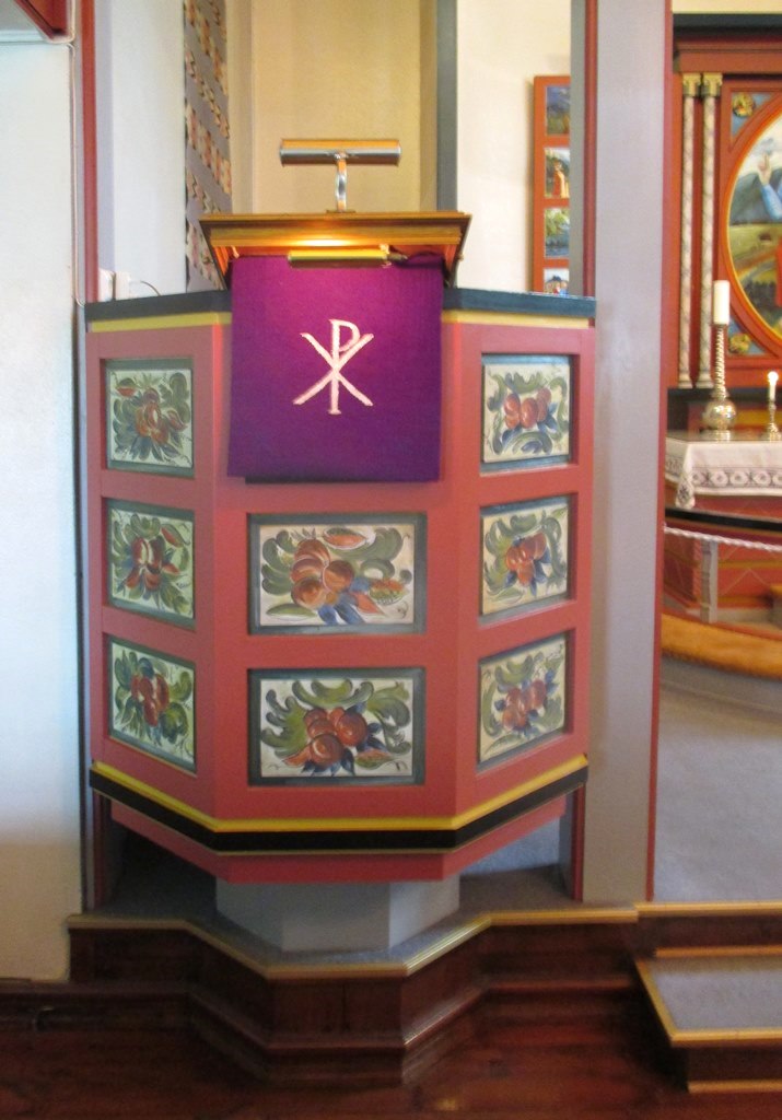 Det ser ut til at Poulsson tegnet prekestolen (nord for korskillet), men snekkerarbeidet er utført av lokale snekkere. Det var en travel periode i forkant av vigslingen, og Poulsson rakk så vidt å dekorere prekestolen et par dager før innvielsen. Dette var tenkt som midlertidig dekorasjon, men er blitt stående.