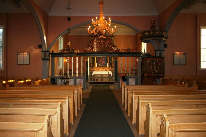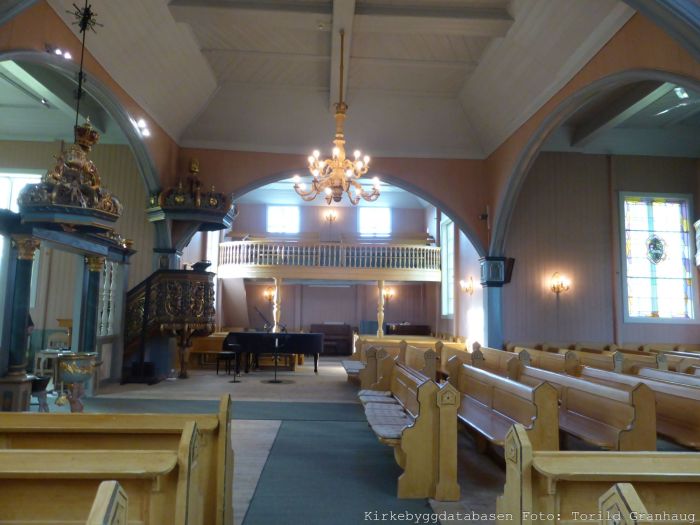 Prekestolen er skåret av Hans Larsen, med rik rocailleornamentikk. Baldakinen er nyere og skåret av Ragnvald Einbu. Hans Jonassen Felde skar den opprinnelige korskranken, men denne ble altså fjernet ved oppussing og «modernisering» til hundreårsjubileet, og dagens korskranke ser ut til å være delvis rekonstruert av Ragnvald Einbu. På korskillebjelken er et monogram for Kristian VII båret av engler.