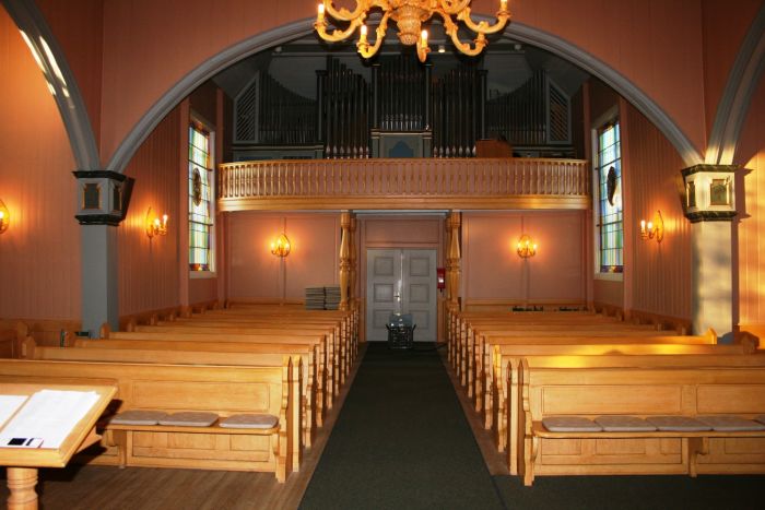 Det er orgelgalleri innenfor vestinngangen og gallerier også i sør og nord. Koret er i østre korsarm. Det er ignen høydeforskjell i gulvnivået.