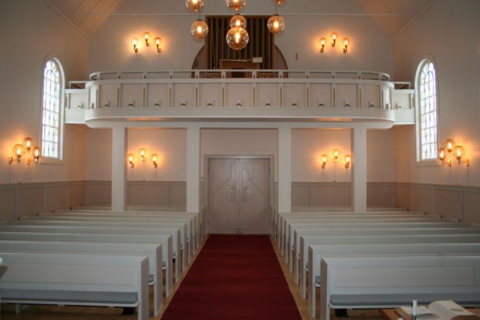 Inne i kirken er det orgelgalleri i vest. Koret åpner seg mot skipet i sin fulle bredde, og korgulvet er hevet to trinn over skipets gulv.