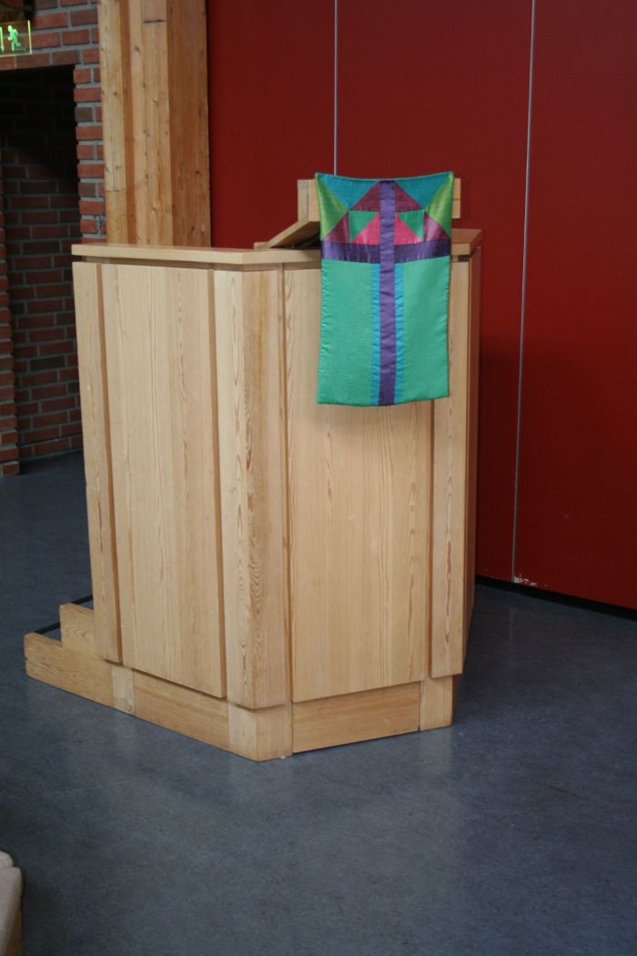 Alteret er trehvitt og har dåps- og nattverdsutstyr i keramikk. Altertavlen er malt av Ingjerd Pettersen-Hagh. Den består av tre bilder. De viser (fra venstre mot høyre) fotvaskingen, oppstandelsen og kvinnene ved den tomme graven. Pettersen-Hagh har også laget et glassmaleri med en hvit due og en liten altertavle i et sideskip (opprinnelig brukt i den nevnte «Kirkekjeller’n») med tittelen «Jesus i drabantbyen».
