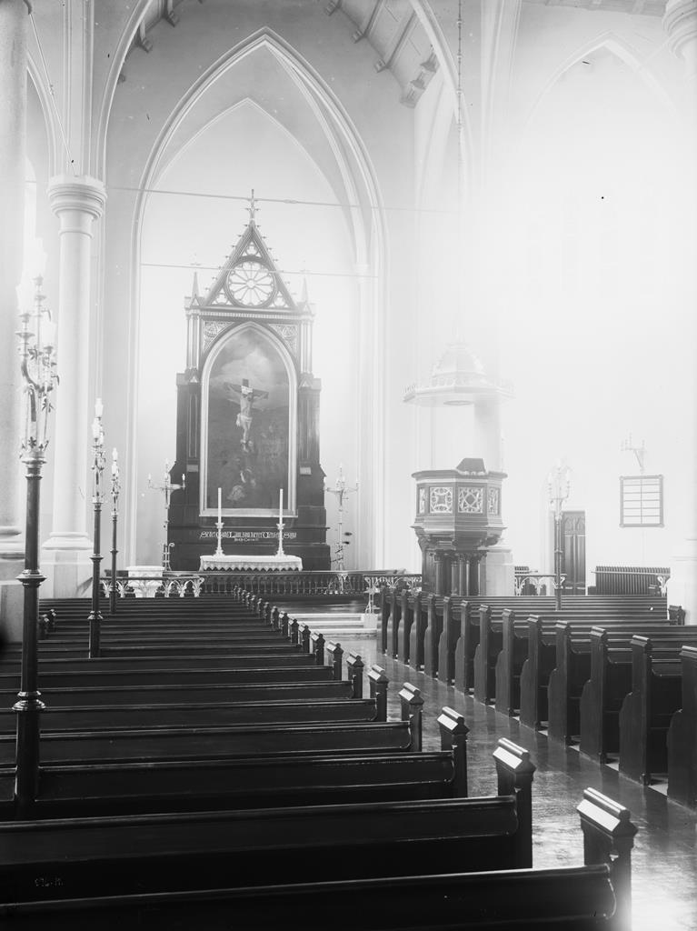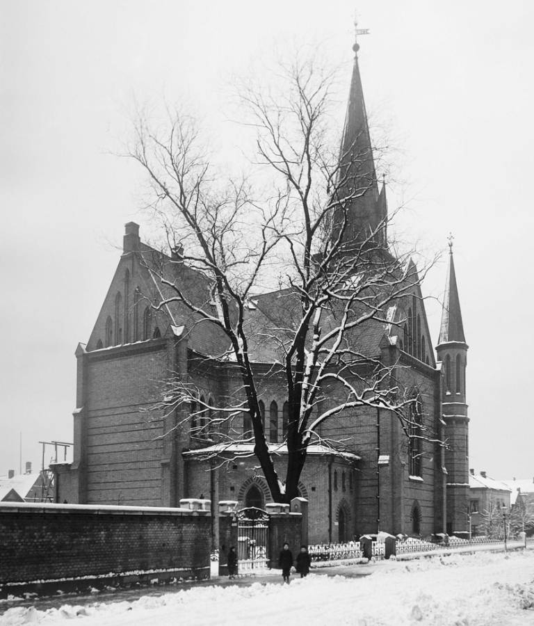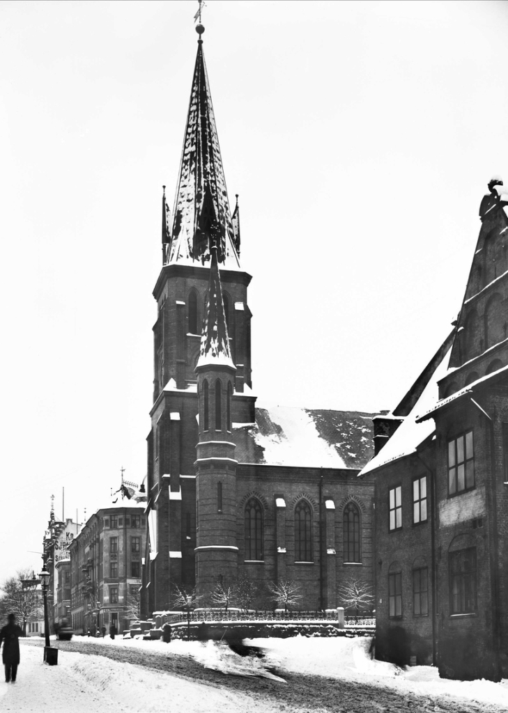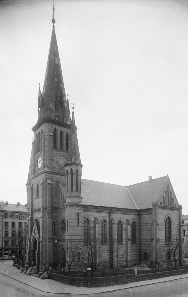 La oss rekapitulere: Hellig Trefoldigheds kirke ble revet etter brannen i 1686 med begrunnelse i nærhet til Akershus festning. Mot slutten av 1700-tallet lot prins Karl av Hessen oppføre en artilleristall, kalt Prindsestalden, på stedet. Denne ble revet i 1860, idet man gjorde tomten klar til å bygge kirken. Stadskonduktør Georg Andreas Bull tegnet kirken i 1868, vanskelige grunnforhold gjorde at byggingen trakk i langdrag, og ti år senere — i 1878 — ble kirken innviet. Det var en nygotisk korskirke i gul tegl, med tårn over hovedinngangen flankert av to småtårn. Årstallet på vindfløyen er forresten 1877. Sognet ble ukskilt fra Trefoldighet i 1874 og omfattet et område begrenset av Kongens gate, Karl Johans gate, Drammensveien, Munkedamsveien, Enga og Pipervika. Senere gjorde Piperviken småkirkemenighet et innhugg i dette området.