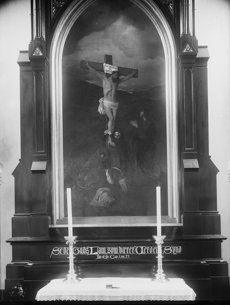 Kirken hadde 1 250 plasser og var enkelt innredet med bare det nødvendige. Altertavlen ble malt av Eilif Peterssen og gitt til kirken. Bildet forestilte Jesus på korset, og teksten under bildet lød: «Se det Guds Lam, som bærer Verdens Synd.» (Joh 1, 29) Motivet er kopiert og brukt i altertavlene i en rekke andre kirker (Aremark, Stavsjø, Hov i Sunndal, Selbu, Eina, Kvernes, Gaupne, Solvorn og Lundring). Under den annen verdenskrig ble bildet sendt til Tyskland og har ikke blitt sett siden. Det ble laget prekestol, døpefont og orgel samt anskaffet annet inventar som man finner i kirker. Veggene ble malt mosegrønne, og det var gardiner «av grønt, tynt tøy». Det ser også ut til at arkitekt og byggekomité måtte kjempe for å få en noenlunde brukbar belysning, og også varmeanlegget skal ha vært mangelfullt. Orgelgalleriet var trangt, med dårlig plass til korsangerne.