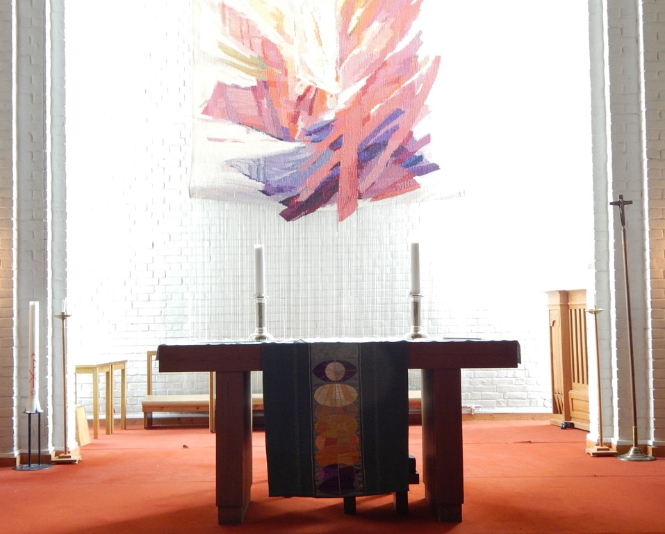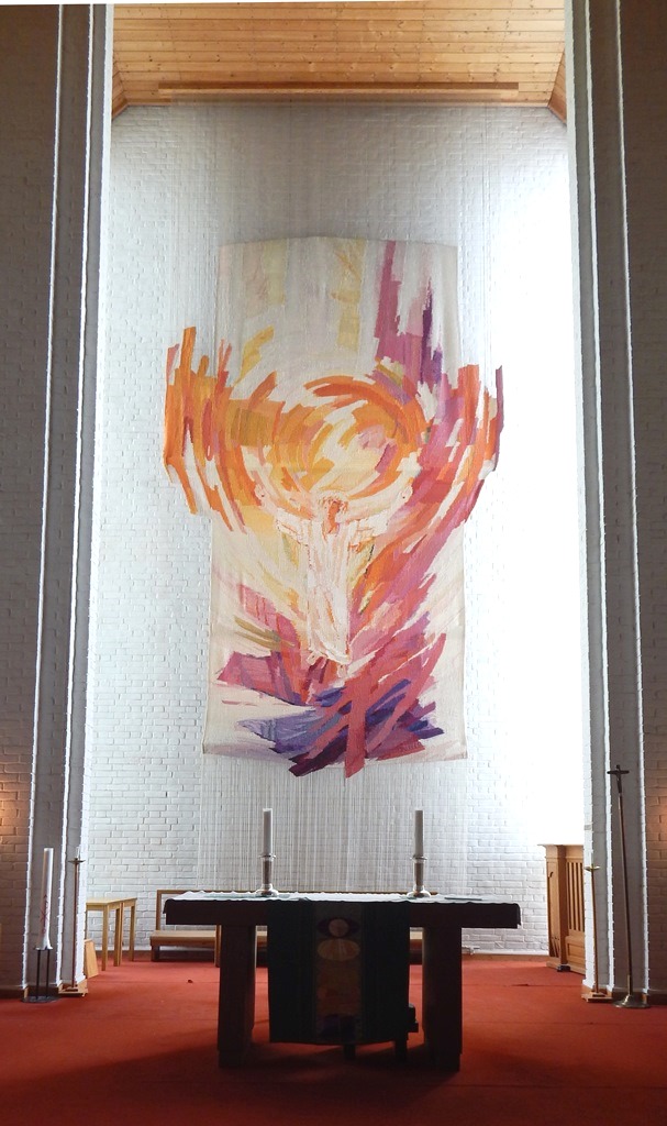 Det var smått med penger til innredning i begynnelsen, og inventaret har kommet til etterhvert. Mest kjent er alterteppet Oppstandelsen av Kari-Bjørg Ile, som kom på plass i 1992. Prekestol og døpefont er utført etter arkitektenes tegninger, og det finnes to kirkeklokker fra Olsen Nauen. Inntil nylig brukte man et Jørgensen-orgel fra 1971, men i 2015 fikk kirken digitalorgel av typen Johannus Monarke Präludium.