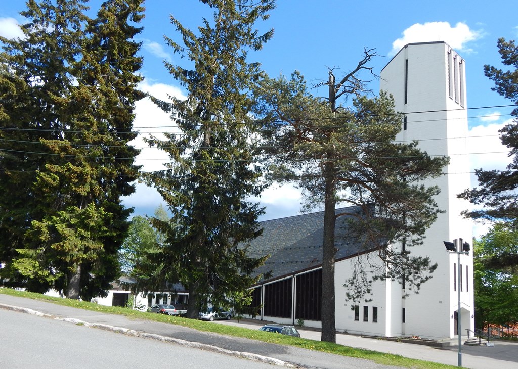 Etter pengeinnsamlinger og mye om og men kom byggingen av selve kirken i gang, og bygget ble innviet av biskopen den 18. februar 1962. Arkitekter var Turid og Kristen Bernhoff Evensen, og byggematerialet er murstein og betong. Mest karakteristisk er vel det 32 meter høye tårnet. Kirken har drøyt 600 plasser. Kirkens historie er ellers fortalt på kirkens eget nettsted.