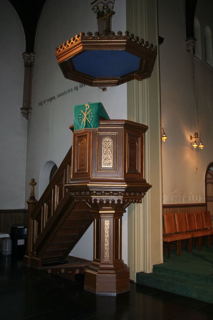 Inne i kirken er det orgelgalleri innenfor inngangen. Koret er polygonalt avsluttet og åpner seg mot skipet i sin fulle bredde. Korgulvet er hevet to trinn over skipets gulv. Prekestolen står i koråpningens venstrekant og har oppgang fra skipet (kirkegulvet).