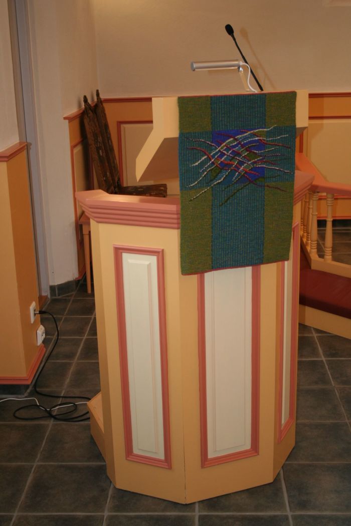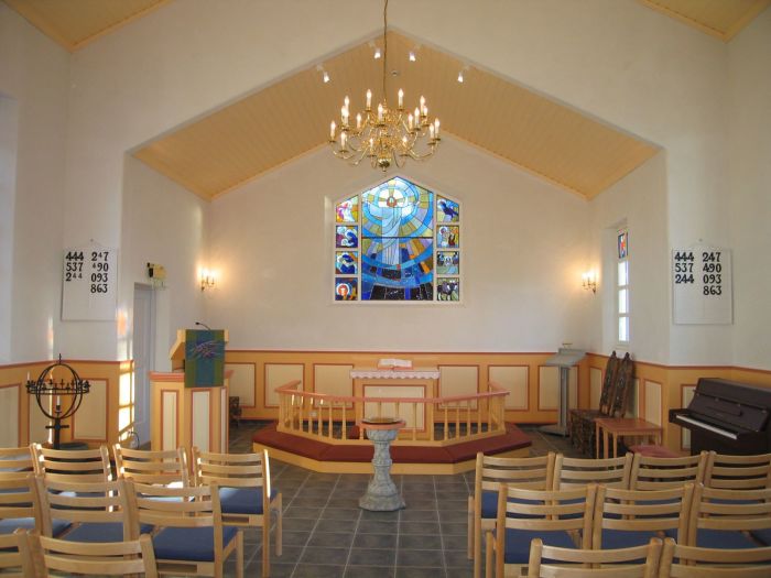 Arkitekten har tegnet kirkens faste inventar, prekestol, alterbord og alterring samt satt interiørfarger og valgt tekstiler i samarbeid med kirkekomiteen. Altertavlen har form av et glassmaleri i korets fondvegg, utformet av Eva Carlberg Westelius. Vinduet har en form som følger gavlvinkelen. I midten er et stort felt med en lysende Kristus, og på hver side er det fire mindre felt med andre motiver. Se også kunstnerens egen skildring samt disse betraktningene.