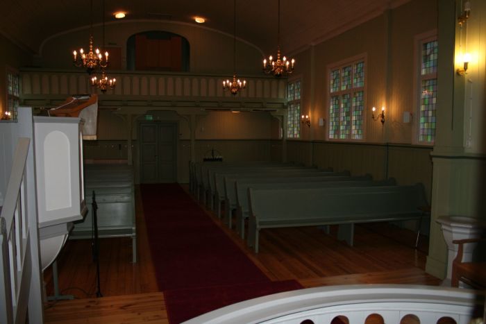 Innvendig er det orgelgalleri i vest. Skip og kor har en slags flattrykt tønnehvelv, og koret åpner seg mot skipet i sin fulle bredde. Korgulvet er hevet to trinnn over skipets gulv. I korets fondvegg er fem rundbuede vinduer med glassmalerier av Veslemøy Nystedt Stoltenberg fra 1979.