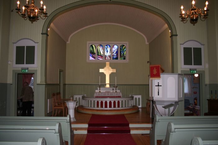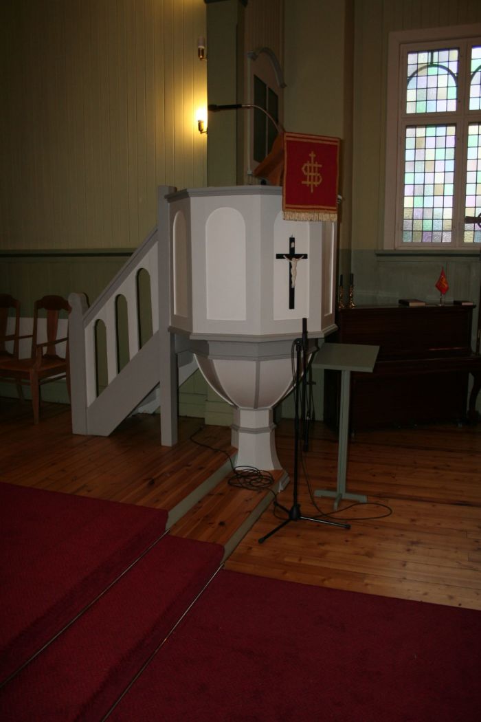 Glassmaleriene er muligens det største blikkfanget, men på alteret står et forgylt kors fra 1979. Prekestolen og den åttekantede døpefonten er på alder med kirken. Orgelet skal være bygget av Norsk Orgel- og Harmoniumfabrikk på midten av 1970-tallet. Det har 6 stemmer ifølge Norsk orgelregister, mens kirkeleksikonet opererer med utrolige 65, kanskje som følge av en uleselig håndskrift. Før orgelet hadde kirken et harmonium av merket Chicago Cottage. Kirkeklokken er på alder med kirken.