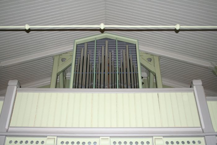 Det er orgelgalleri innenfor inngangen. Koret åpner seg mot skipet i sin fulle bredde, og korgulvet er hevet et lite trinn over skipets gulv. Det er en lav skranke på hver side av midtgangen. I korets fondvegg er et vindu med glassmaleri (motiv Kristus in mandorla). Dette er ifølge kirkeleksikonet fra 1950.