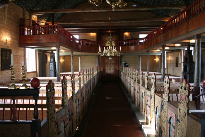 Det er gallerier i vest og langs nordveggen og deler av sørveggen. Koret åpner seg mot skipet i sin fulle bredde. Korgulvet er to trinn høyere enn skipets gulv. Himlingen i skipet har påmalt stjernehimmel, mens himlingen i koret har ranker og bibelske figurer. Over korbuen er kongemonogrammet til Frederik IV.