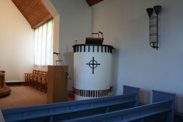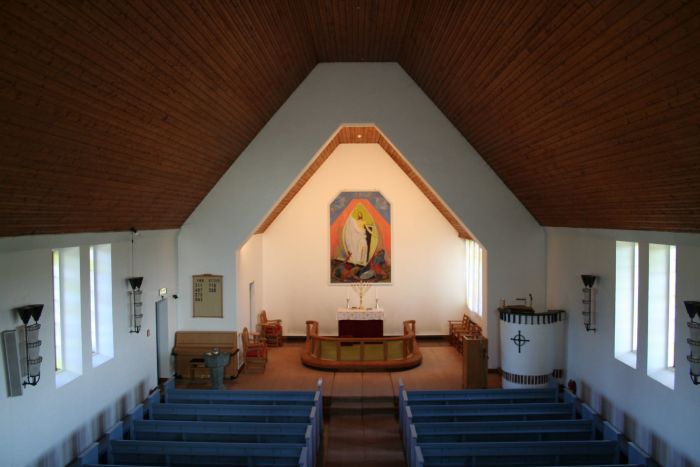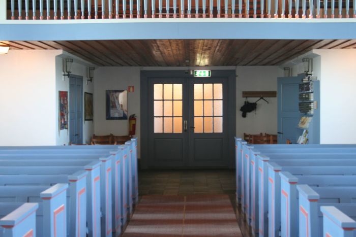 Det er galleri innenfor inngangen. Koret åpner seg mot skipet i sin fulle bredde, og korgulvet er hevet et par trinn over skipets gulv. Prekestolen er i skipets østre hjørne (til høyre for koret).