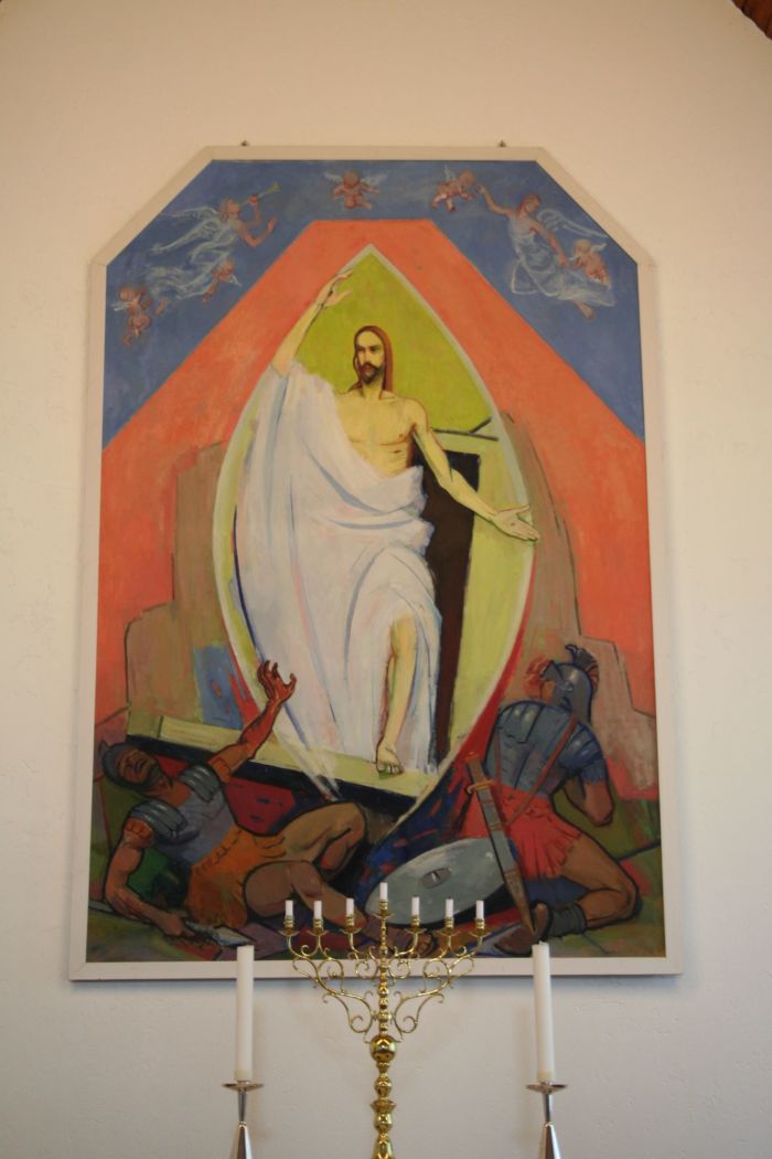 Alterbildet er en variant av motivet Kristus in mandorla, i kirkeleksikonet beskrevt som «Jesus står opp og kommer ut av graven». Bildet er laget av Thoralf Gjesdahl og er på alder med kirken. Døpefonten av kleberstein er åttekantet og kalkformet. Den er formgitt av arkitekt Helland og hugget av en kunsthugger Løw-Andersen. Kirkeklokken ble støpt av O. Olsen & Søn. Kirken overtok først orgelet fra gamlekirken, men fikk i 1960 et 12 stemmers orgel bygget av Landrog. I 2011 overtok kirken et digitalorgel fra Nærbø kirke.