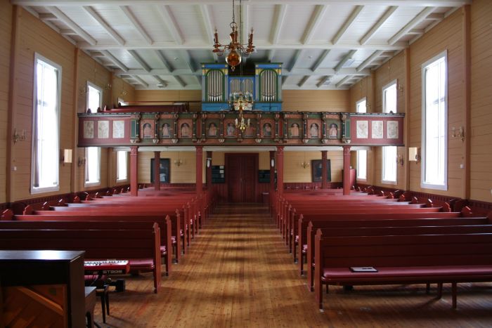 Det er orgelgalleri innenfor inngangen. Koret åpner seg mot skipet i sin fulle bredde, og korgulvet er tre trinn høyere enn skipets gulv.