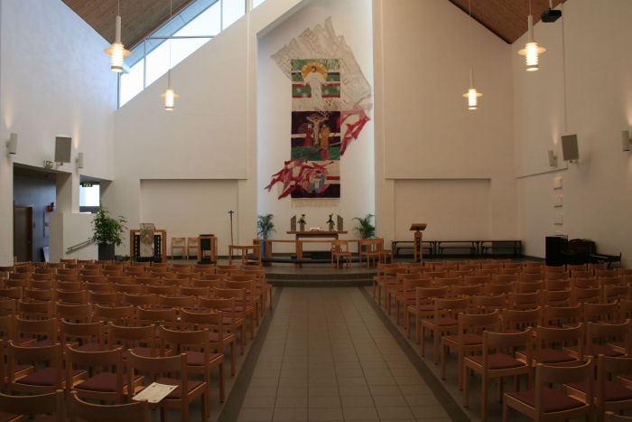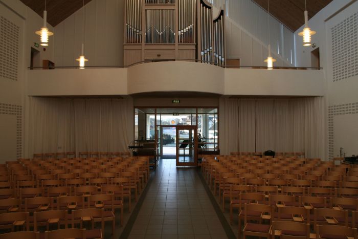 Selve kirkesalen er for en langkirke å regne, altså rektangelformet, og antall sitteplasser er 250. Interiøret er også preget av hvitt, og rommet er møblert med stoler. Koret er på et podium i nord, og det er orgelgalleri innenfor inngangen i sør.