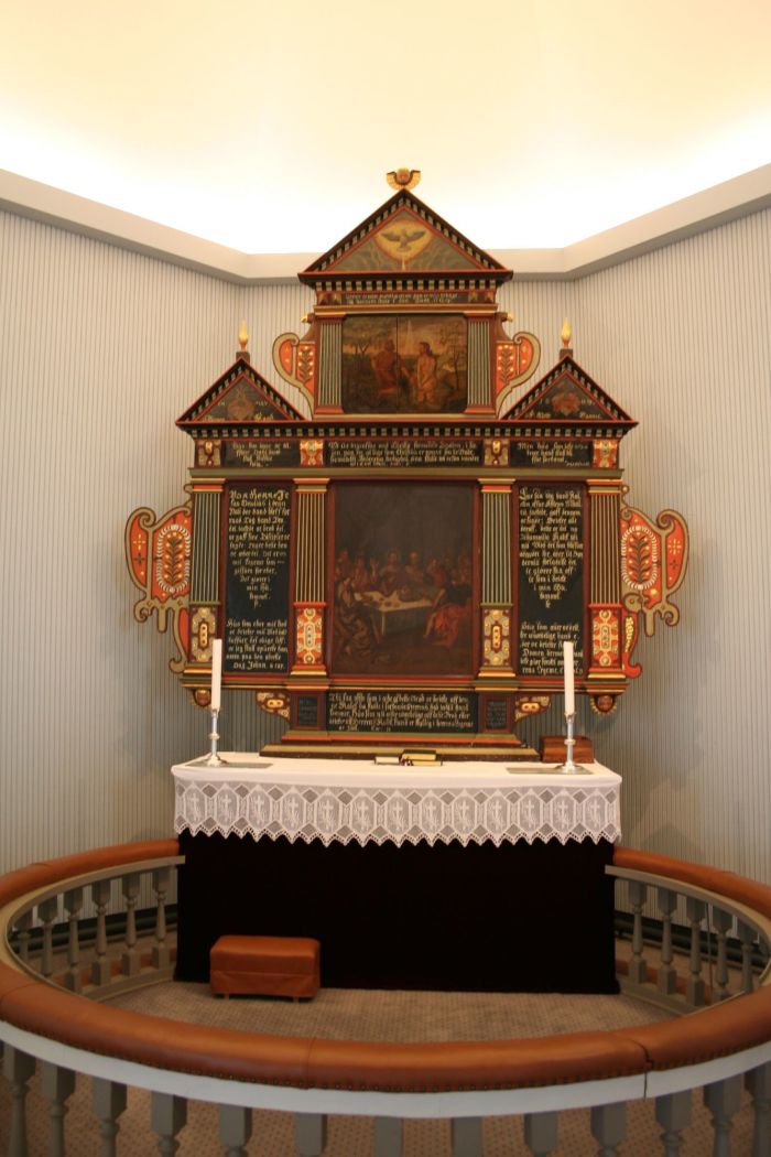 Altertavlen er fra 1620-årene og altså overført et par ganger fra tidligere kirker. Den går for å være skåret av en Thomas Snekker og malt av Peter Reimers. Hovedfeltet viser nattverdens innstiftelse, og over dette er et bilde av Jesu dåp i Jordanelven. Mellom og rundt disse bildene er en rekke tekstfelt. Prekestolen og døpefonten er overført fra Linstow-kirken og formgitt av Linstow. Førstnevnte skal være snekret av Tollak Gudmestad, mens døpefonten er laget av Torger Husveg. Orgelregisteret og kirkeleksikonet er skjønt enige om at kirken har et 23 stemmers NOHF–orgel fra 1959. Dette orgelet ble utbedret i 2020–2021.