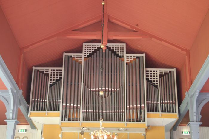 Det er orgelgalleri innenfor inngangen, og søylerader gir kirkerommet et visst tredelt preg, selv om vi ikke har med en regelrett basilika å gjøre. Koret åpner seg mot skipet i sin fulle bredde, og korgulvet er hevet tre trinn over skipets gulv. Interiøret ble for øvrig endret noe til femtiårsjubileet. Slik så det ut tidligere.
