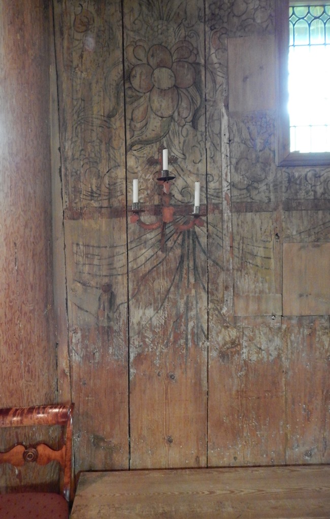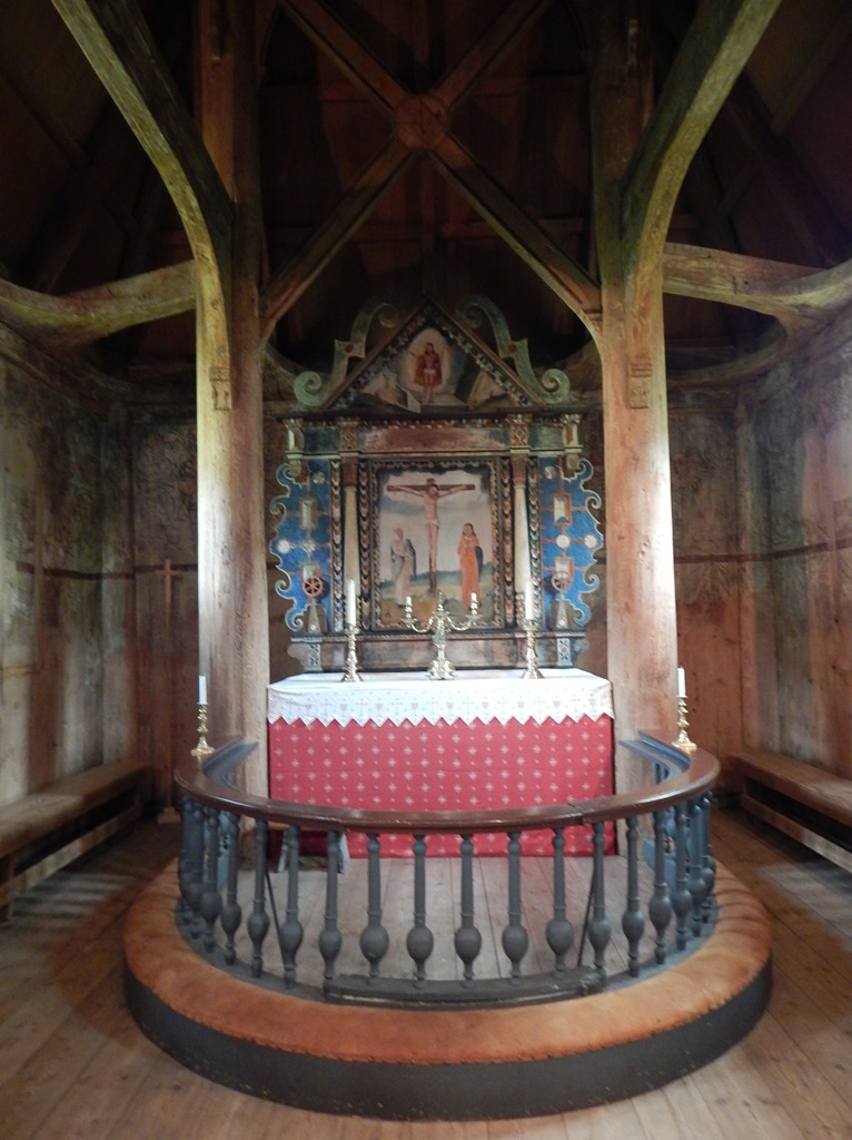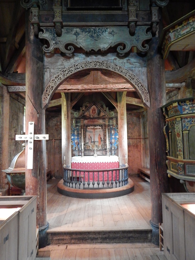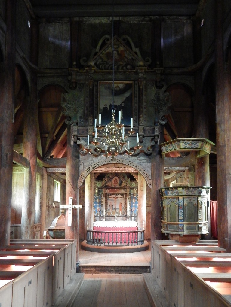 Stavene i kirkerommet er nokså nakne og uten de kapitelene man finner i f.eks. Borgund stavkirke. På veggene skimtes rester av malt dekor med ranker og draperier samt noter. Kirkerommet bærer mest preg av 1600-tallet med lite av middelalderrester. En liten slik rest er imidlertid en utskåret bue i koråpningen som antas å stamme fra en alterbaldakin hvis rester er å finne i Bergens museum sammen med et forkomment alterfrontale og en del av et krusifiks. I De heibergske samlinger er en kirkedør fra 1600-tallet og en altertavle fra 1865 malt av Anders Askevold.