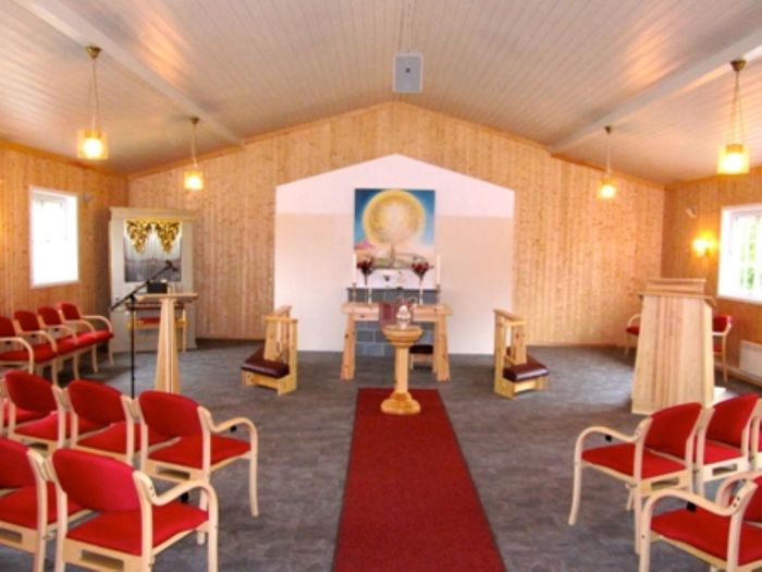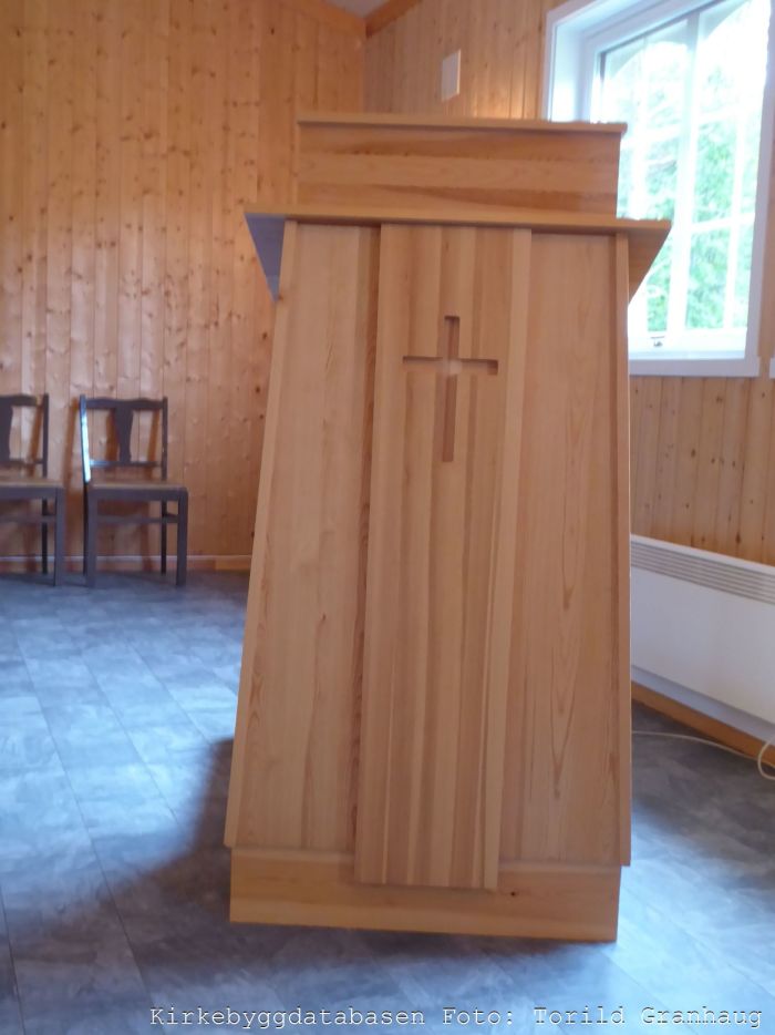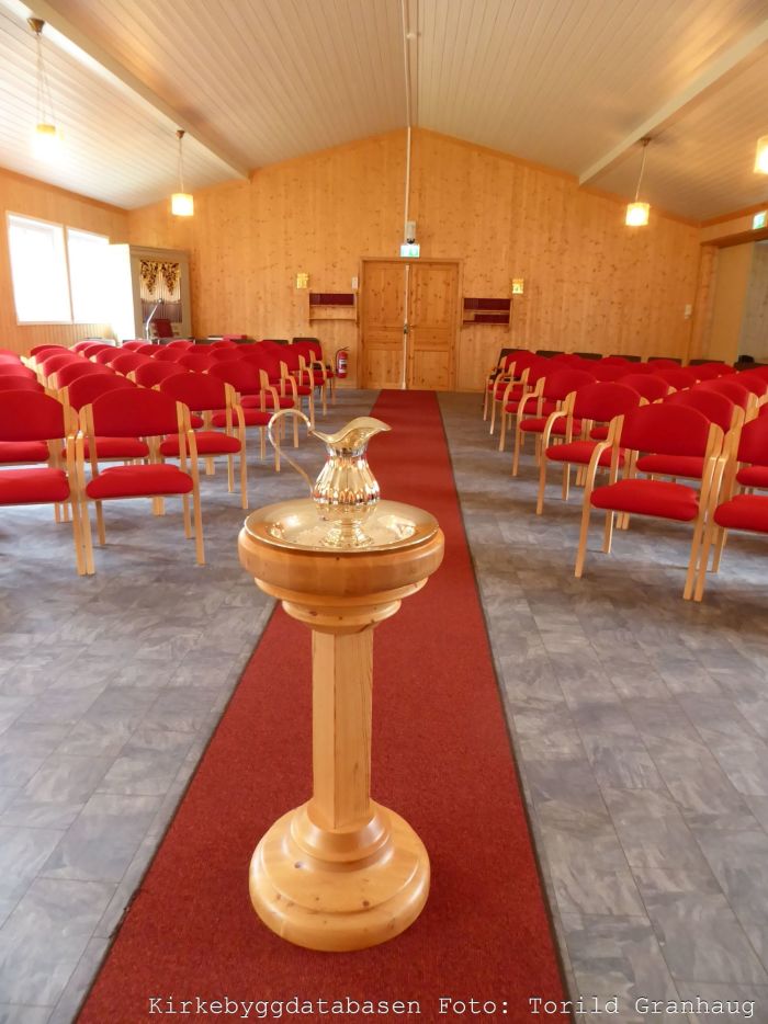 Korfunksjonene er i samme rom som skipet, og det er ingen nivåforskjell i gulvet. Kirkerommet er møblert med vanlige stoler. Alterbildet er malt av Trygve Olsen. Prekestolen er formgitt av Harald Farstad. Det finnes også en liten, flyttbar lesepult. Døpefonten er laget av Sigfred Persen. Kirken har et fire stemmers orgel fra Robert Gutavsson fra 2002.