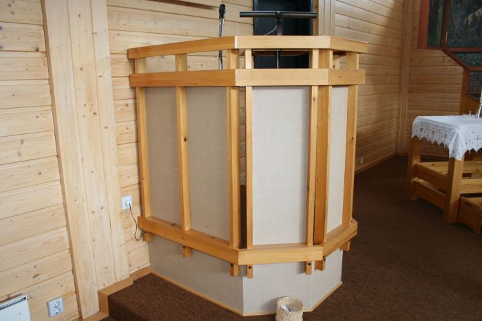 Kirkerommet er møblert med stoler som er skråstilt langs en akse som følger rommets diagonal. Trehvit er dominerende farge.