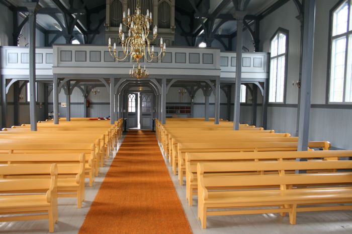 Det er orgelgalleri innenfor inngangen. Himlingen i skipet er tredelt med søylerader, idet himlingen på utsiden av søylene mot langveggene er flat. Koret åpner seg mot skipet i sin fulle bredde, og korgulvet er hevet to trinn over skipets gulv. Korets fondvegg har et åttekantet vindu over altertavlen.