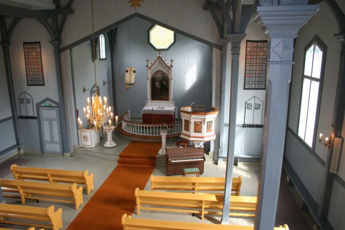 Prekestolen står i koråpningens høyrekant og har oppgang fra koret. Selve den åttekantede stolen er på alder med kirken, men utsmykningen stod Karl Erik Harr for i 2005, da stolens fyllinger fikk evangelistbilder. Døpefonten ser ut til å være sekskantet. Kirkeklokken ble omstøpt av O. Olsen & Søn i 1946. Kirkens første orgel var et gammelt Brantzeg-orgel overtatt fra Ibestad kirke. I 1946 fikk kirken et August Nilsen–orgel som var bygget for Melhus kirke i 1892. Dette ble i 2023 sagt å trenge restaurering (jf. filmopptak). Behovet ble bekreftet i menighetens årsmelding for 2024.