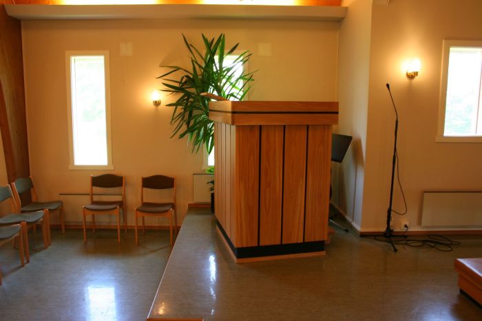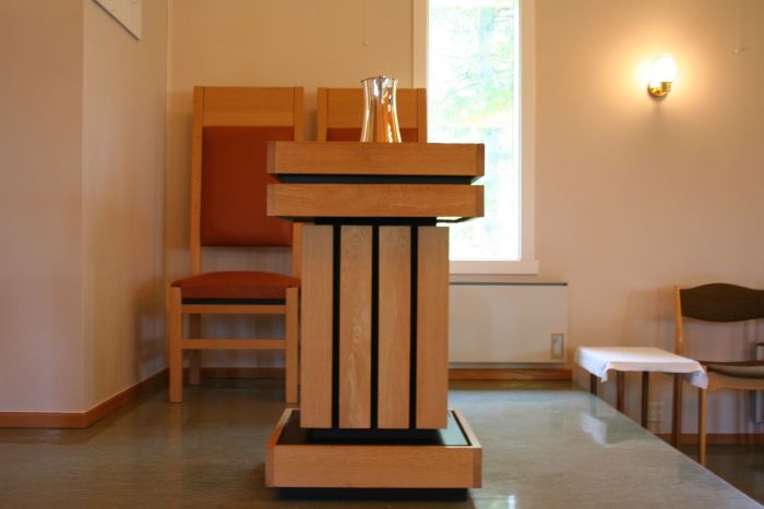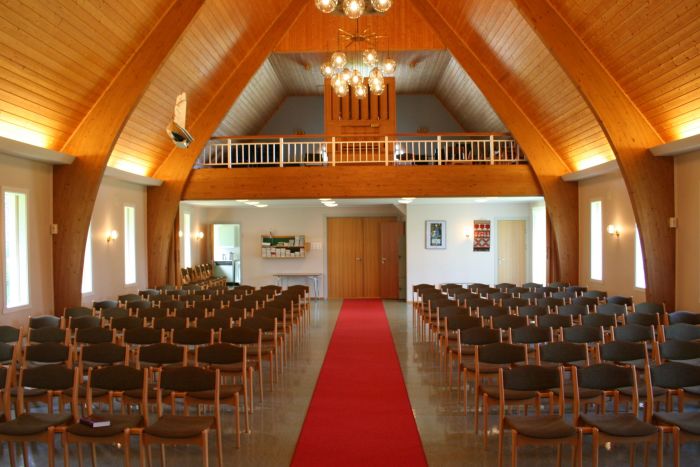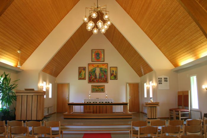 Det er orgelgalleri innenfor inngangen, og i sør åpner koret seg mot skipet i sin fulle bredde. Korgulvet er hevet et par trinn over skipets gulv. Den enkle prekestolen står oppe på podiet i koråpningens venstrekant og har. Det er ingen ballustrade eller lignende som korskille.