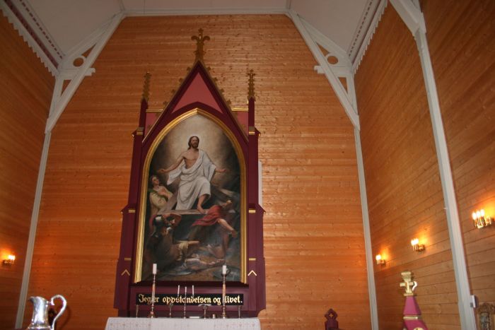 Altertavlen er av det nygotiske slaget og har en kopi av Adolph Tidemands oppstandelsesbilde i Bragernes kirke, her malt av Christian Eggen. Akkurat som i Drammen er teksten under bildet hentet fra Joh 11, 25: «Jeg er Opstandelsen og Livet».