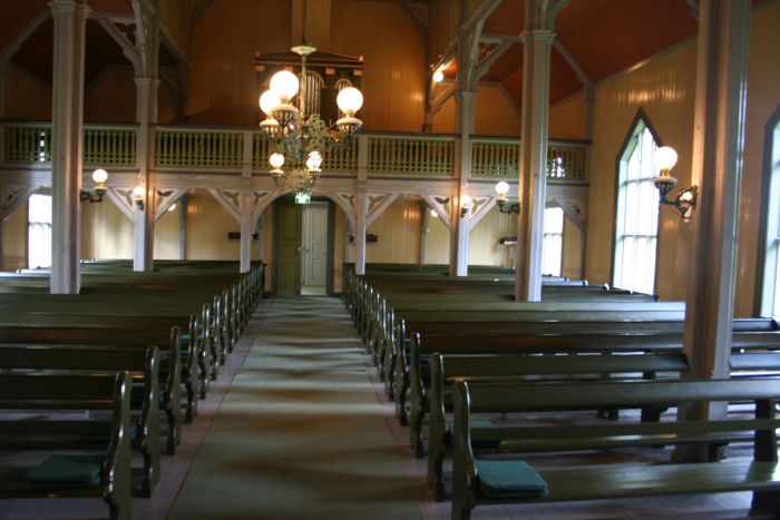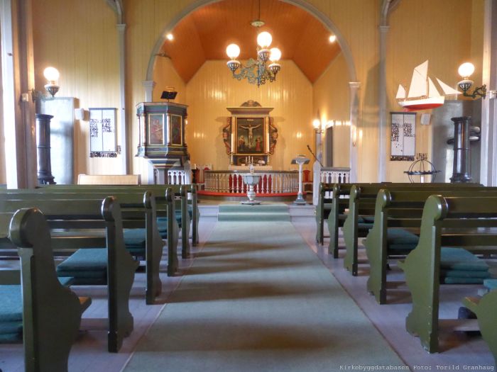 Det er orgelgalleri rett innenfor vestinngangen. Koret åpner seg mot skipet i sin fulle bredde, og korgulvet er hevet et par trinn over skipets gulv. Det er korskille i form av en lav skranke på hver side av midtgangen. Inventargjenstander er som nevnt overført fra Skånland.