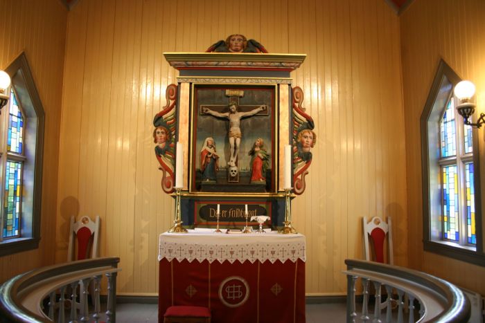 Den barokke altertavlen antas å være utført i 1778. Den har et korsfestelsesbilde i storfeltet, og under bildet kan vi lese: «Det er fuldbragt.» (Joh 19, 30) Denne tavlen ble imidlertid satt inn i krien først i 1952 etter å ha blitt hentet fra Skånland i 1939. Opprinnelig hadde kirken en annen tavle som siden er overført til Sandstrand bedehus.