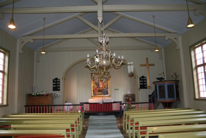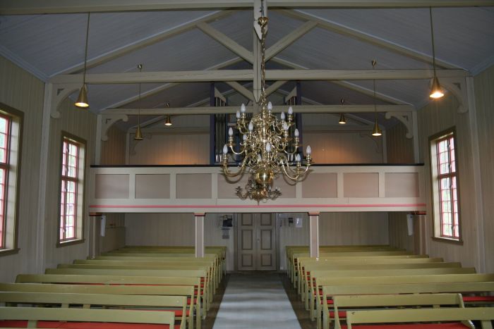 Det er orgelgalleri ved inngangen. Koråpningen har en litt flat rundbueform. Korgulvet er hevet et par trinn over skipets gulv og utgjør et podium som strekker seg utenfor selve koråpningen. Prekestolen står inntil skipets sørvegg og har oppgang fra koret.