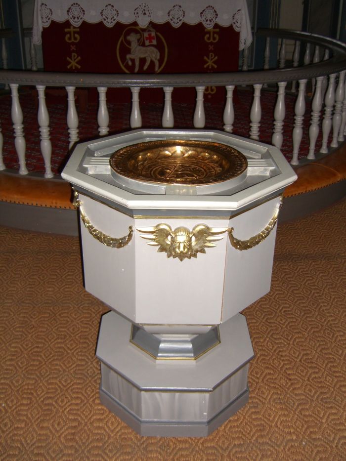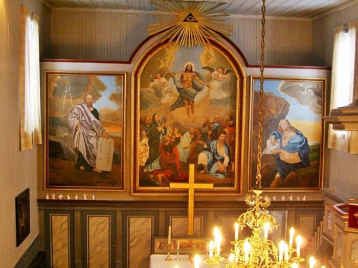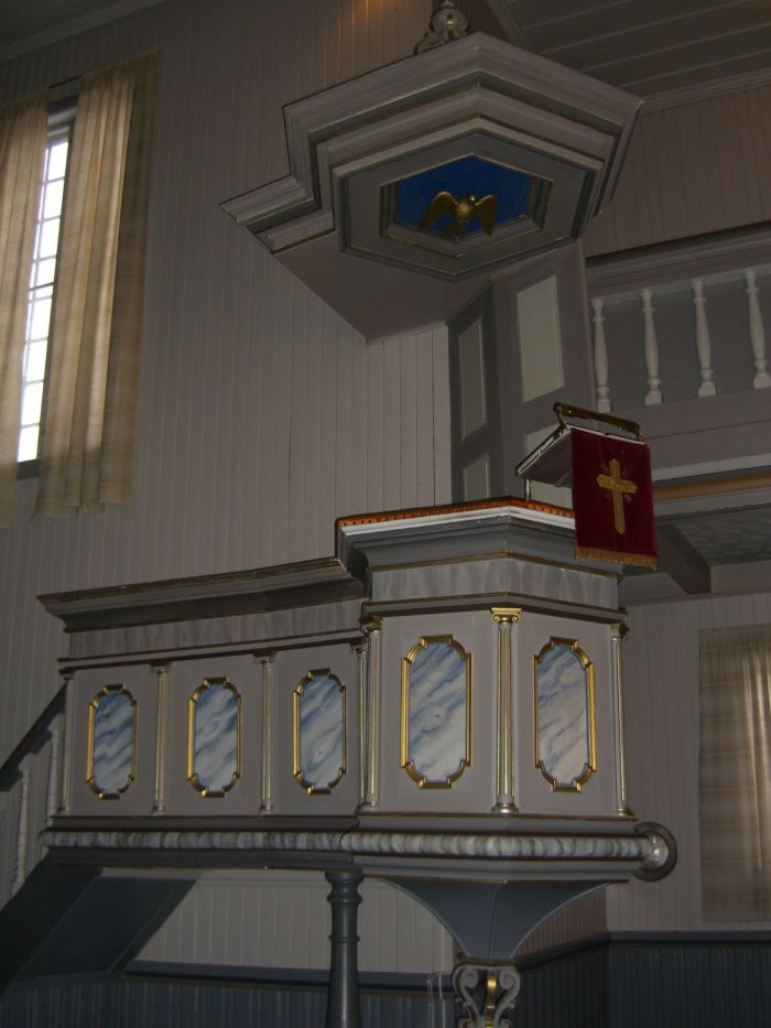 Prekestolen er i koråpningens høyrekant og har oppgang fra koret. Den er på alder med kirken. Altertavlen har tre bilder. Det store bildet i midten viser himmelfarten, og på sidene ser vi Moses med lovtalene og Johannes på Patmos. Disse bildene ble malt av Eilert Balle Lund da kirken var ny. Ifølge kirkeleksikonet skal det i kirken også finnes trerelieffer av Knut Skinnarland fra 1962 som forestiller kvinnene ved graven, nattverden og Jesus i bønn i Getsemane. Trondheim byleksikon og Wiki Strinda forklarer at det dreier seg om en altertavle som avløste Balle Lunds. Bildet hos Kirkesøk viser imidlertid at Balle Lunds bilder dominerer på fondveggen mens de nevnte relieffene er av mindre format og står som en billedfrise bakerst på alteret. Over dem er et kors som delvis står i veien for oppstandelsesbildet.
