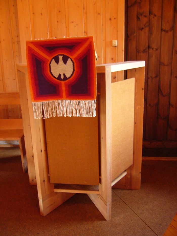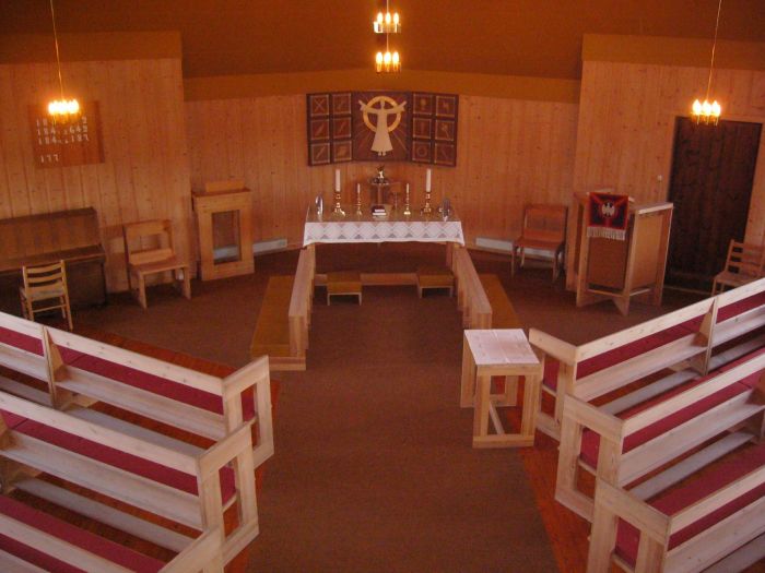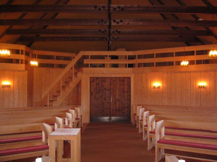 Inne i kirken er kirkebenkene skråstilt i forhold til lengdeaksen. Det er galleri bak i kirkerommet.