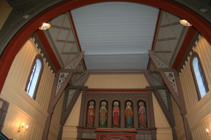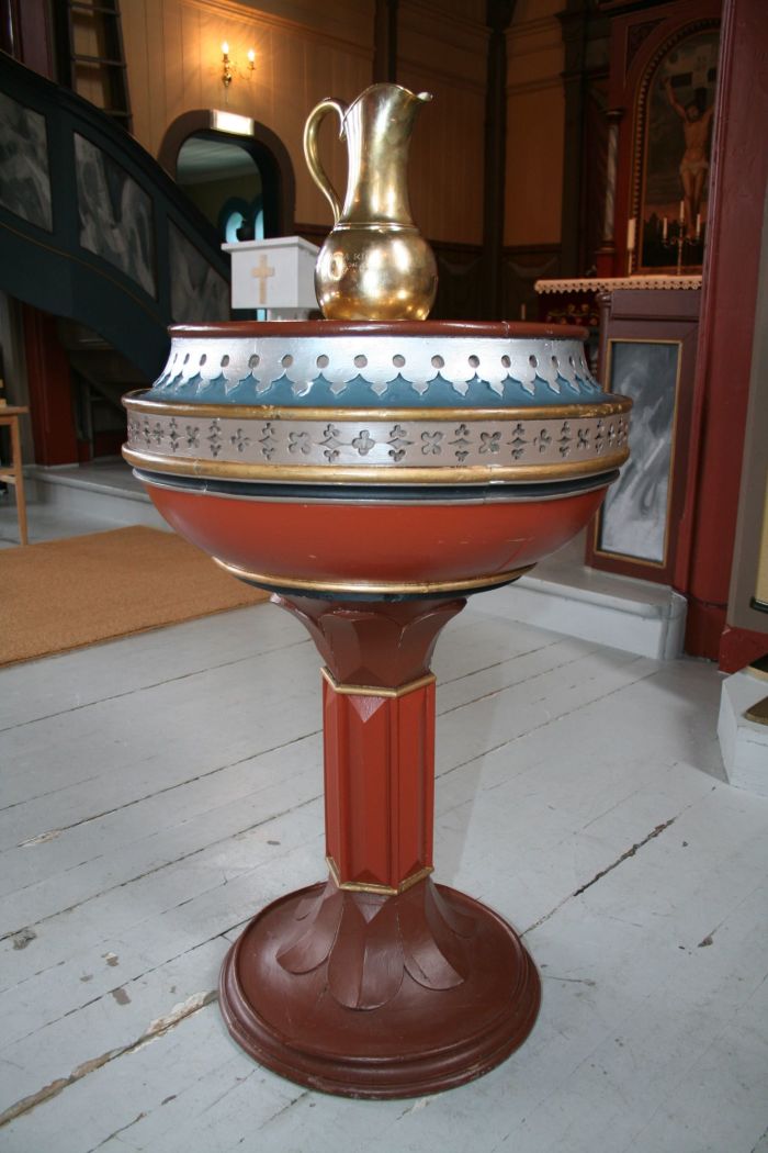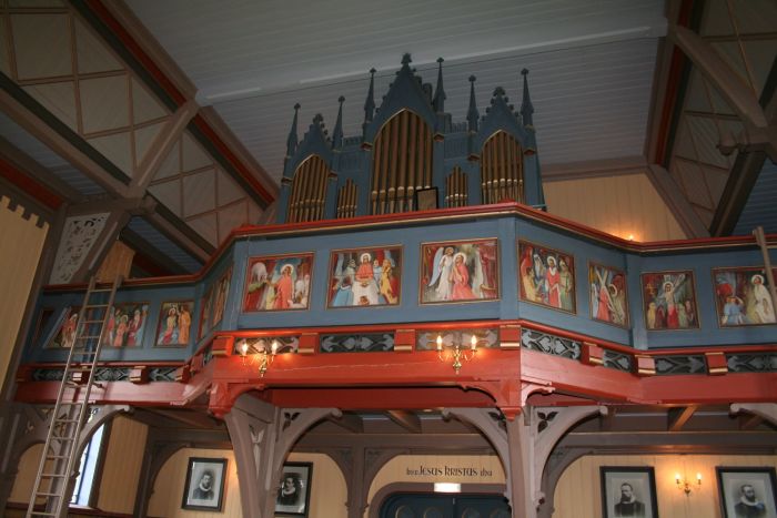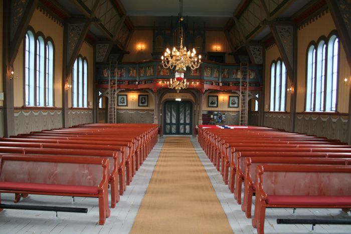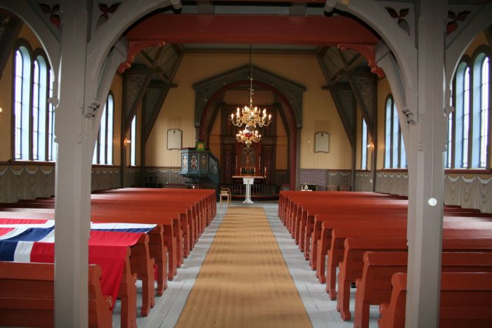 Det er orgelgalleri innenfor inngangen. Koråpning, vinduer og dører har rundbuer. I korets østvegg er det høyt oppe et fem fags vindu med farget glass som senere er dekket til innvendig med malerier. I koret er det også klokkerstol på sørsiden. Altertavlen med korsfestelsesmotiv ble malt av Waldemar Wilberg. Denne samt prekestolen og døpefonten skal være på alder med kirken, men prekestolen fikk påmalt evangelistbilder av Paul Størseth i 1953. Størseth har også malt galleribrystningen, som har bilder med scener fra Jesu liv, samt maleriene over altertavlen (som dekker over nevnte vindu).