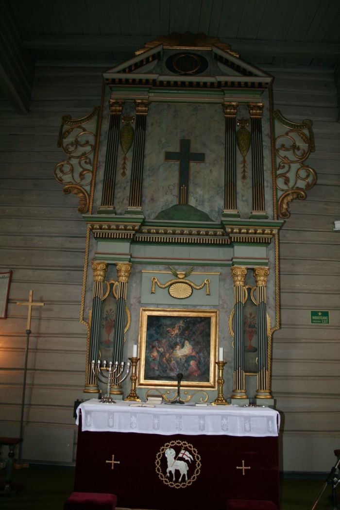 Innvendig er det gallerier i vest og til litt innpå de østre skråveggene. Det er ingen forskjell i gulvnivå mellom korområdet og resten av kirkerommet. Mellom to søyler er det tilsynelatende korskille i form av skranker med åpning i midten, men det finnes et par benkerader øst for dette.