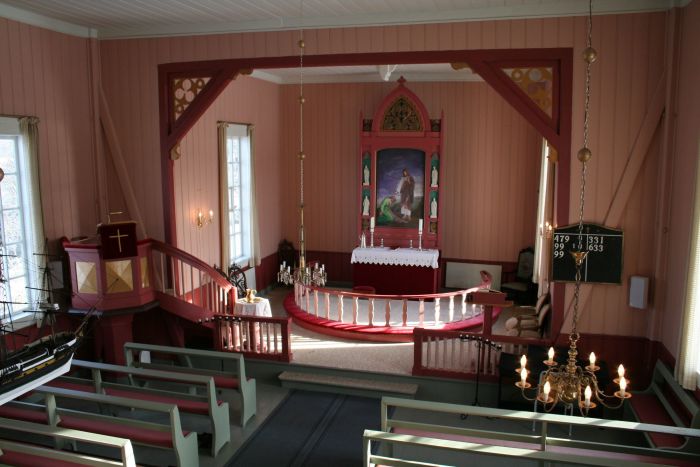 Altertavlen er ifølge kirkeleksikonet laget av Andreas Nilsskog i 1934, og motivet beskrives som «Jesus forbarmer seg over en kvinne». Klokkene sies å være støpt av Hustad (1872) og H. Sundt (1812). Det ser ut til at kirken har et harmonium.