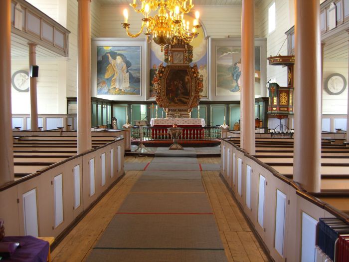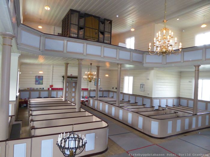 Innvendig er det galleri i vest samt i tverrarmene. Koret er i østre korsarm, og korgulvet er hevet et lite trinn over skipets gulv. Ifølge kirkeleksikonet er to altertavler, skjønt bildet på Kirkesøk ser ut til å vise bare én i bruk, men dessuten en rekke store bilder på veggen bak. Prekestolen og døpefonten overført fra gamlekirken. Den ene kirkeklokken, støpt av Arent Hedemark i 1801, er formodentlig også overført, mens den andre sies å være støpt av Wisløff og Olsen i 1901. Orgelet er bygget av Norsk Orgel- og Hamoniumfabrikk ca. 1958. Det skal finnes flere malerier som er overført fra gamlekirken. Kan det være disse som henger på alterveggen?