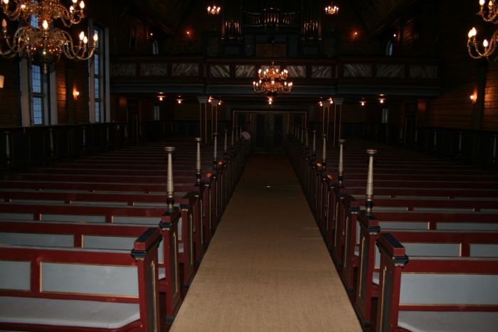 Byggmester Gustav Olsen fikk allerede i 1861 i oppdrag å utarbeide planer for ny kirke. I utgangspunktet hadde man tenkt å bygge den på den gamle kirkegården ved siden av gamlekirken, men stedet ble ansett som uegenet og planene endret, og kirken stod altså der dagens kirke står. Den ble vigslet den 1. november 1864. Dette var en laftet langkirke. Den hadde gallerier langs langveggene helt frem til koret, og korgulvet var et par trinn høyere enn skipets gulv. Den tredelte altertavlen var malt av Eilert Balle Lund. Storfeltet i midten hadde et himmelfartsbilde. Til venstre var et bilde av Moses med lovtavlene og til høyre Johannes på Patmos.