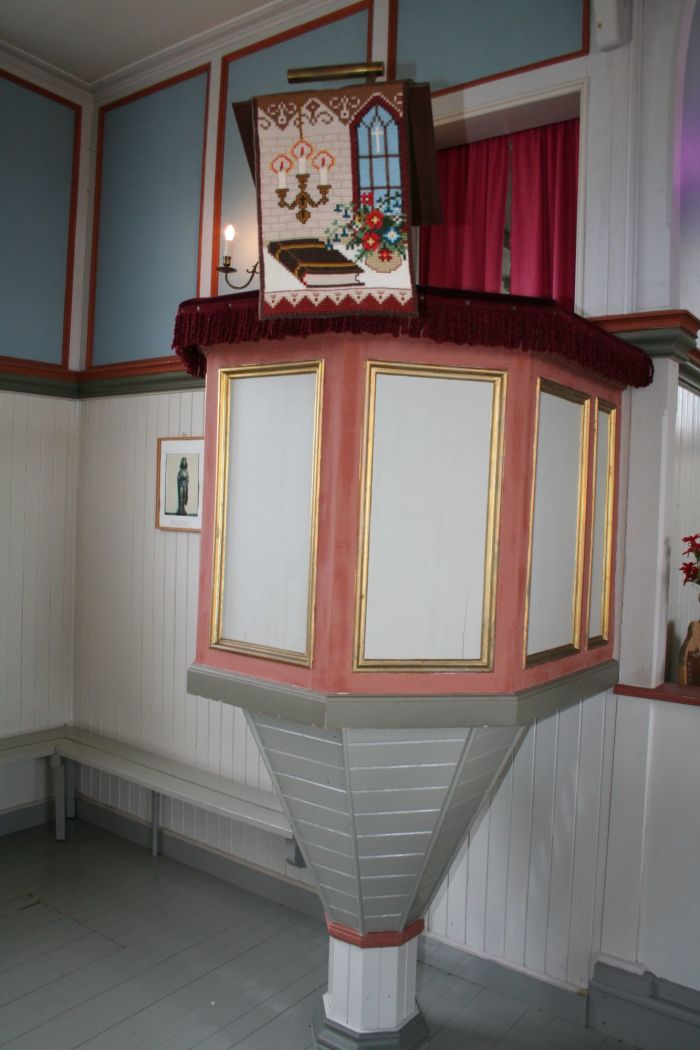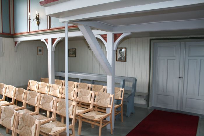 Det er galleri bakerst i kirkerommet. Korgulvet er et bitte lite trinn høyerre enn skipets gulv.