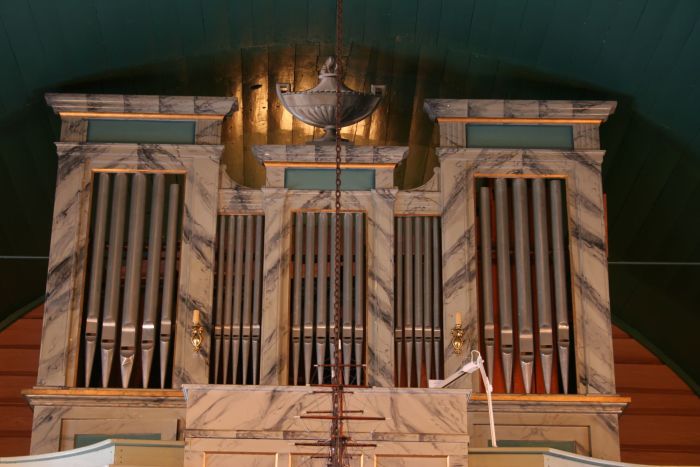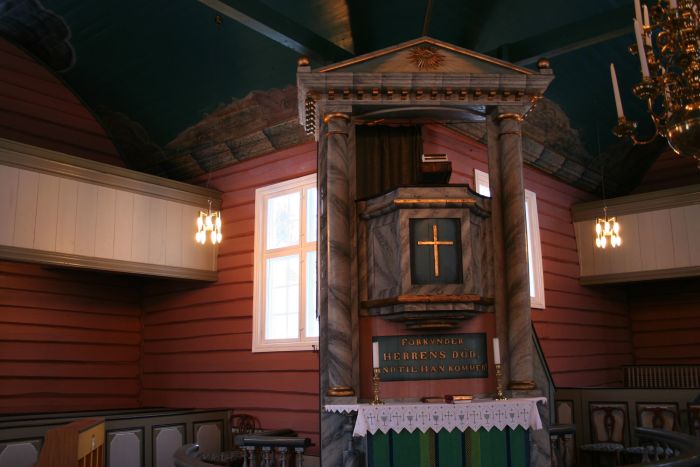 Det malte laftetømmeret er synlig inne i kirkerommet. Kirken har prekestolalter i kryssets nordøstre hjørne, hvilket må sies å være en relativt uvanlig løsning. Dette er fra 1839, laget av Abraham Jensen; før det hadde kirken hatt alter midt i kirkerommet slik at presten stod bak alteret med ansiktet mot menigheten når han forrettet. Det er ikke noe regelrett alterbilde. Prekestolen er dekorert med et kors, og under den står et skriftstykke: «Forkynder Herrens Død ind til han kommer!» (1 Kor 11, 26) Det er galleri i enden av alle korsarmene og orgel på galleriet i vest (eller altså vest-nordvest).