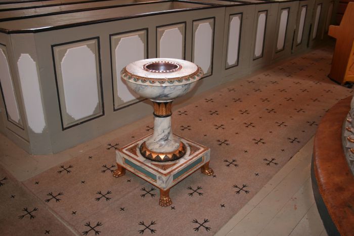 Opprinnelig hadde kirken en døpefont festet til veggen til venstre for prekestolen. Den frittstående døpefonten som brukes i dag, er overtatt fra Oddernes kirke. Den er opprinnelig fra 1827 og kom til Austad i 1930.