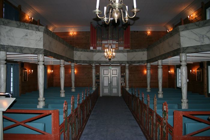 Innvendig er det flattelgjede laftetømmeret synlig. Det er søylebåret galleri i vest og et stykke langs langveggene. Korguvet er hevet tre trinn over skipets gulv.