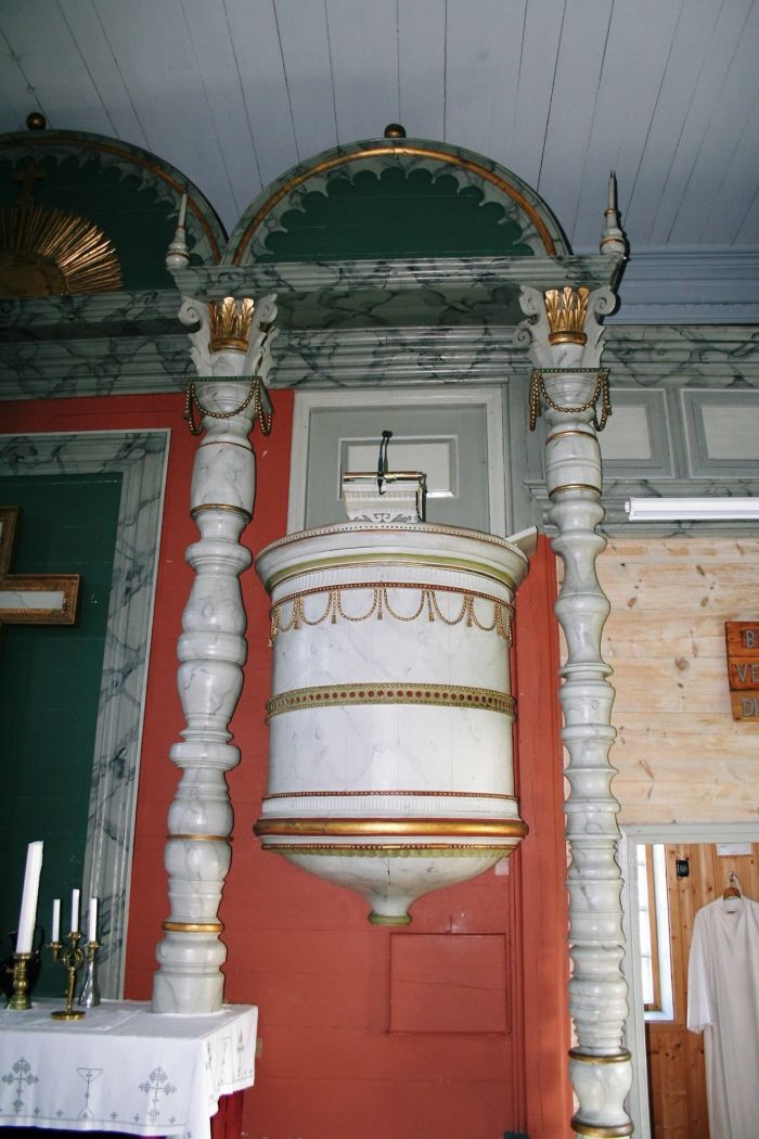 Korveggen omtales i jubileumsboken som sakrastiveggen. Det er som om kirken har en variant av prekestolalter, skjønt det er ikke prekestol over selve alteret og altertavlen. I stedet er det to prekestoler — én på hver side av alteret, høyt oppe på veggen — for å gjøre det symmetrisk. Stolen til venstre er overført fra gamlekirken, mens den til høyre, som ser ut til å være den som brukes, er fra da kirken var ny. Til hundreårsjubileet ble for øvrig interiøret pusset opp og inventargjenstander fra gamlekirken tatt i bruk. Jubileumsboken omtaler i så måte en kjerringstol, en brudestol, en lysekrone, lysestaker og dåpsfat, men har ingen konkrete opplysninger om selve døpefonten.